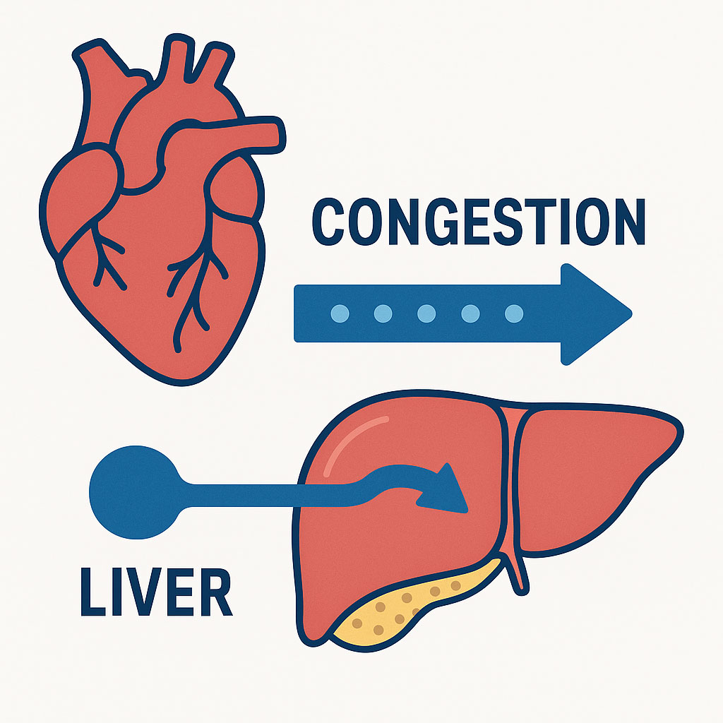 ✔ ② 혈류 정체(울혈) — 간 자체 문제가 아닌 2차 변화 심장 기능이 떨어지면 간으로 들어오는 혈류가 정체되면서 간이 부어 보이는 울혈성 간비대가 나타납니다. 이 경우 간은 스스로 문제가 생긴 것이 아니라 심장 쪽 이상으로 인해 간의 크기가 변한 상황입니다. 심장 잡음이 있거나 기침이 잦은 아이, 노령견에서 초음파로 간비대가 포착되면 심장 쪽을 함께 확인하는 이유가 바로 이것입니다.