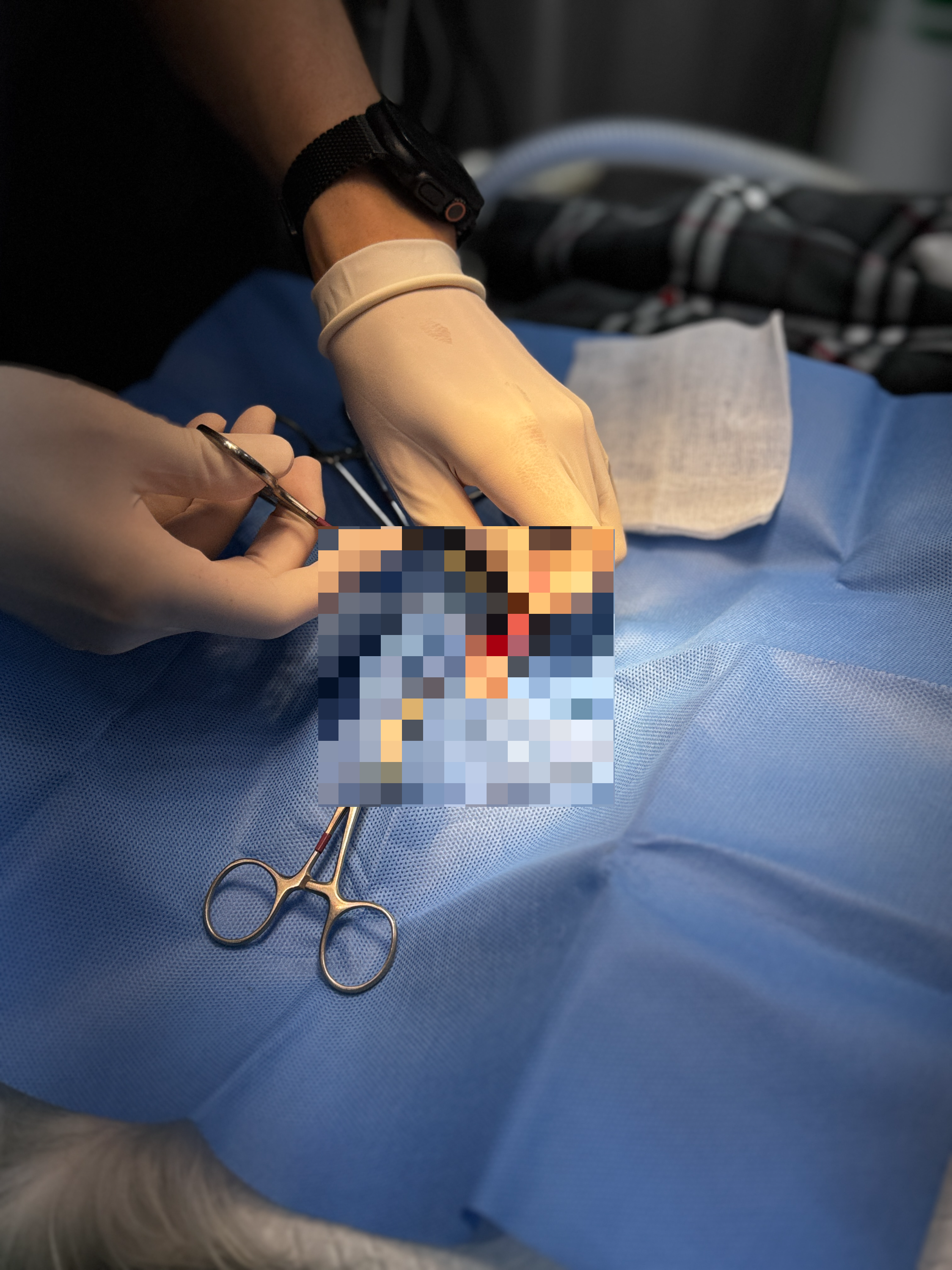 정상 위치의 고환은 일반적인 방식으로 제거하며, 복강 내에 있는 잠복 고환은 숙련된 기술로 최소 절개를 통해 안전하게 적출합니다. 일반 중성화보다 시간이 조금 더 소요되지만, 정교한 술기가 필요한 단계입니다.