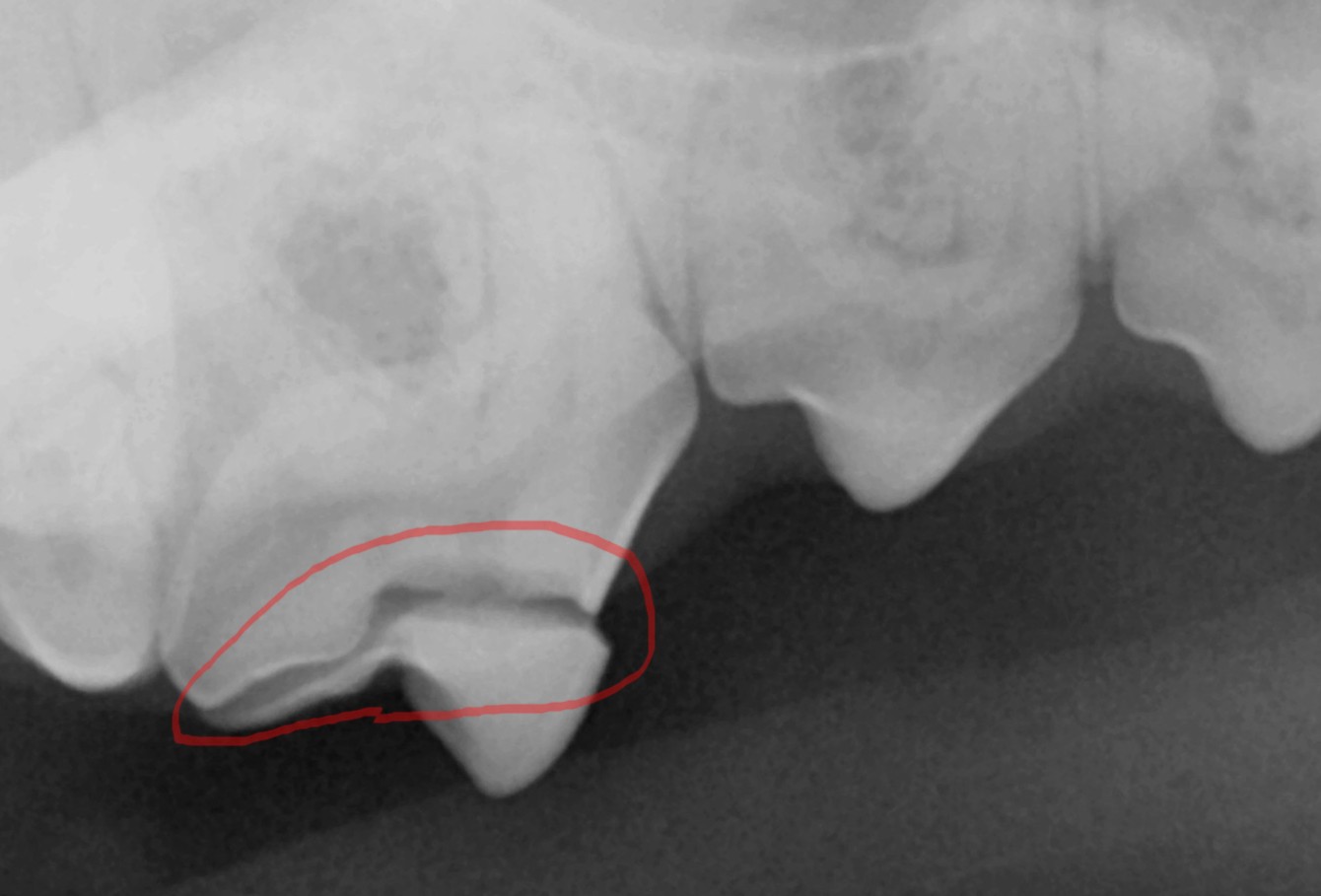 엑스레이 결과, 우측 상악 제4전구치(p4)는 법랑질과 상아질이 함께 손상된 복합 치관 파절로 확인되었습니다. 치수강 근처까지 금이 이어져 있어 보존 치료는 불가능했기 때문에, 결국 수술적 발치를 진행하기로 결정했습니다.