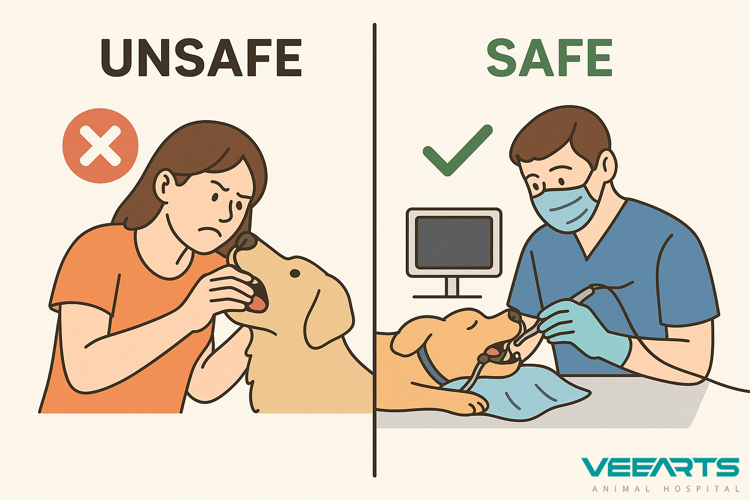 단도직입적으로 무마취 상태에서는 강아지가 입을 계속 벌리고 있을 수 없기 때문에 수의사가 잇몸 아래 깊은 치석을 제거하는 것은