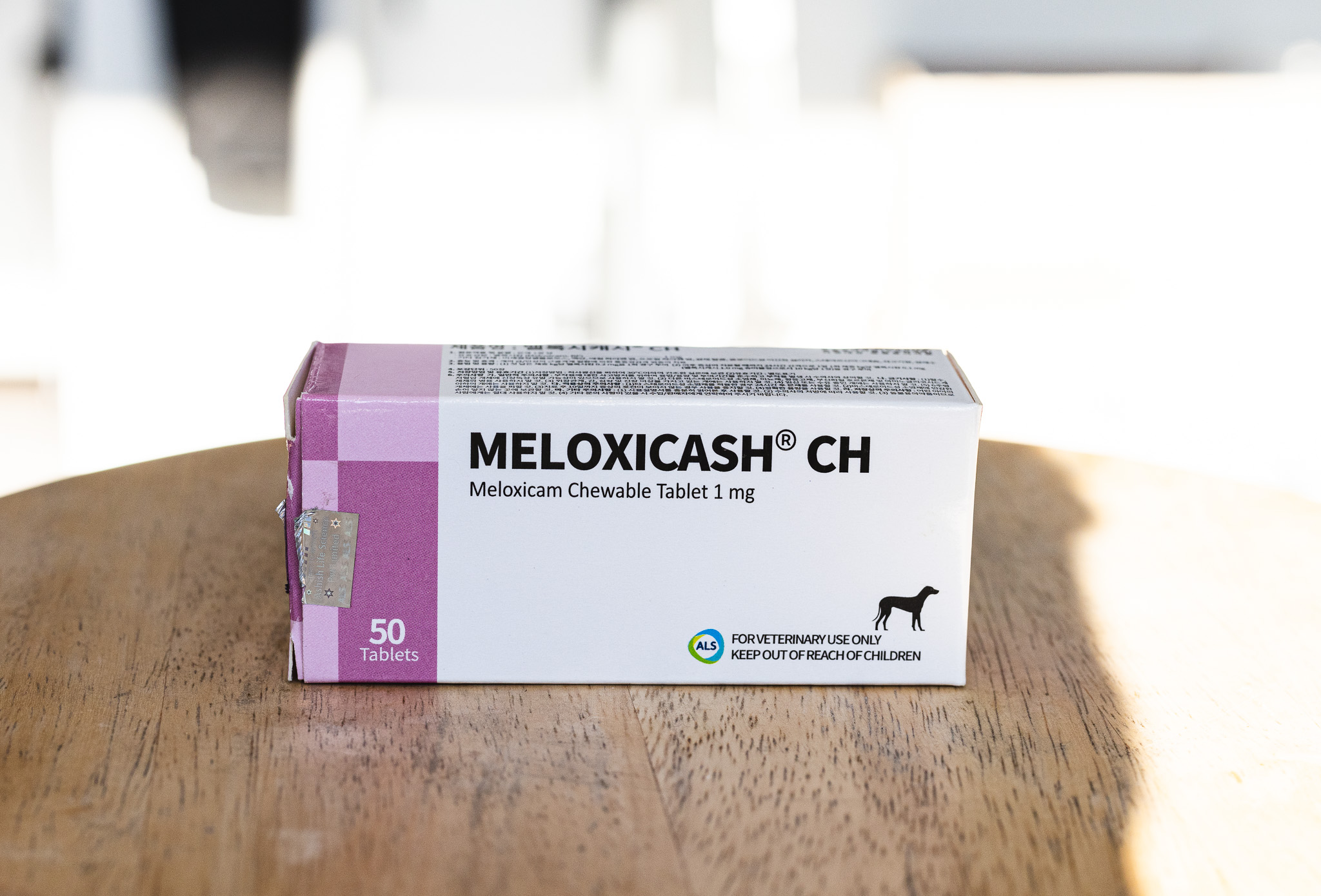 첫날은 체중 kg 당 멜록시캄 0.2mg을 1회 경구 투여 이후 중상이 치료될 때까지 24시간 간격으로 1일 1회 체중 kg당 멜록시캄 0.1mg(멜록시캐시 1.0mg 츄어블정으로서 10kg당 1정)을 경구 투여