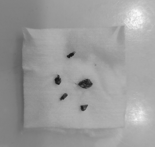 제거된 귀지는 사진에서 보시는 것처럼 생각보다 크고 단단했습니다. (위의 첨부 이미지를 이 위치에 삽입하세요!) 이렇게 딱딱한 덩어리가 고막 바로 앞에서 오랫동안 압박을 가하고 있었으니, 아이가 느꼈을 답답함과 이물감은 상상 이상이었을 것입니다. 마치 우리 귓속에 커다란 돌덩이가 박혀서 빠지지 않는 것과 같은 불편함이었겠죠.