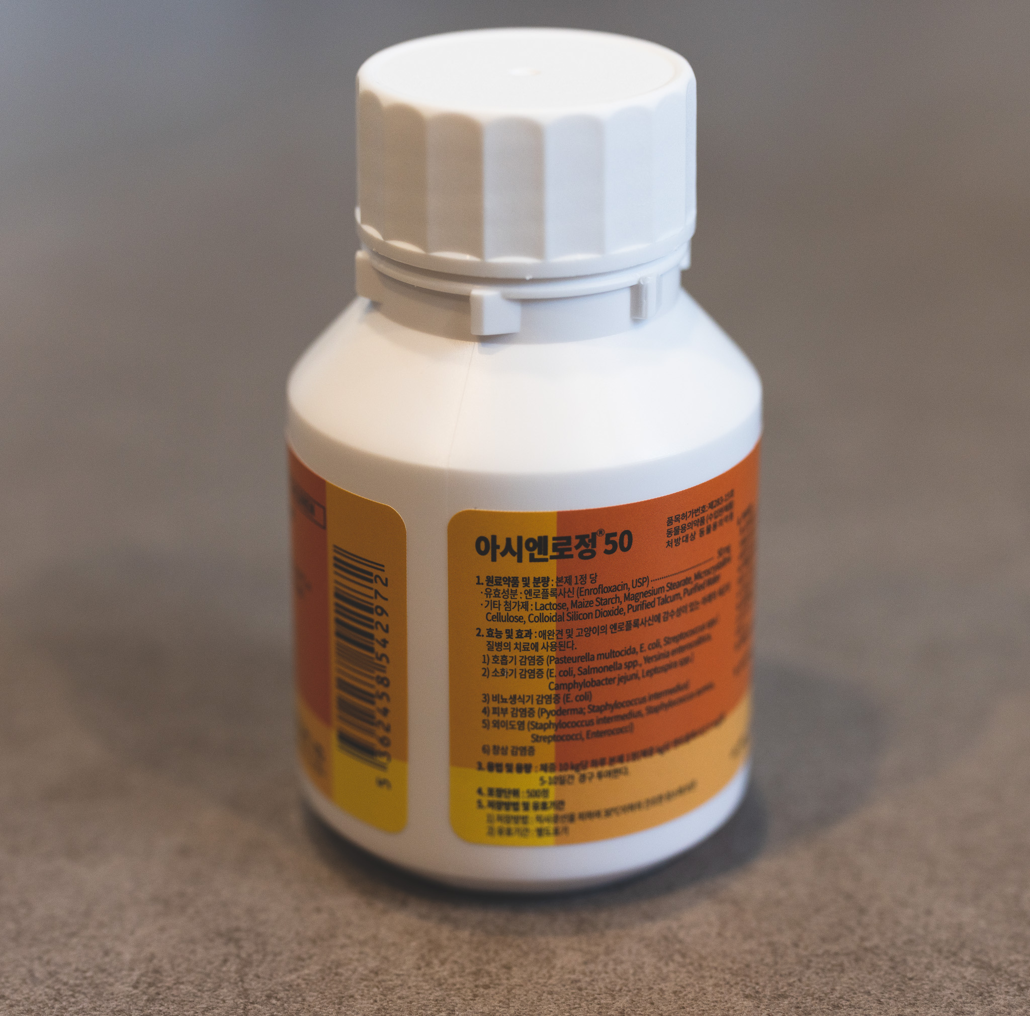 반려동물 광범위 항생제 엔로플록사신(Enrofloxacin) 동물전용의약품 아시로엔정50 효과.부작용
